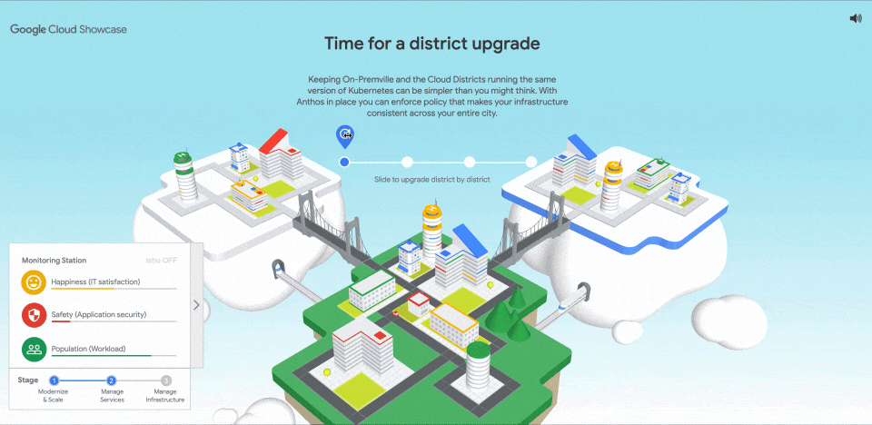 We had the unique and challenging opportunity to create an online demo that provided a place for hundreds of thousands of Next audience members to experience and interact with Google Cloud. We gamified this digital showcase to be “Sims-like” so it was highly engaging and interactive which enhanced the hands-on learning experience for users. This demo appeared onsite at Google’s Next event where thousands joined in attendance.